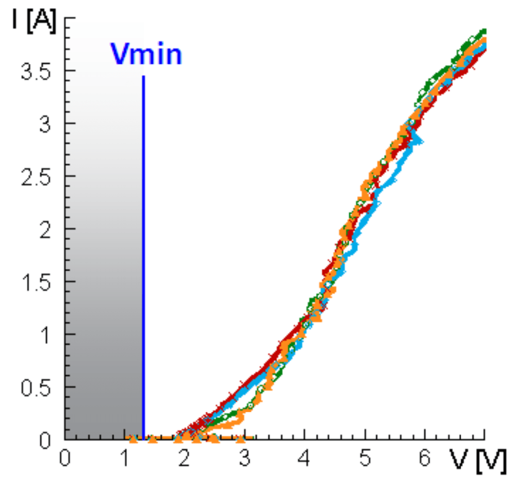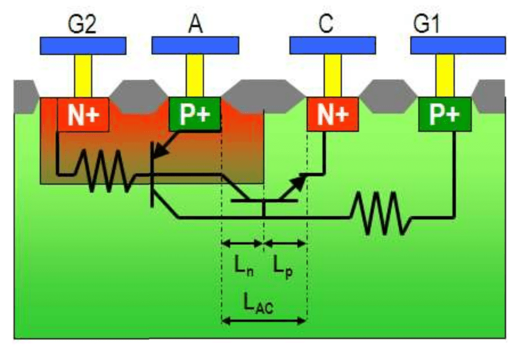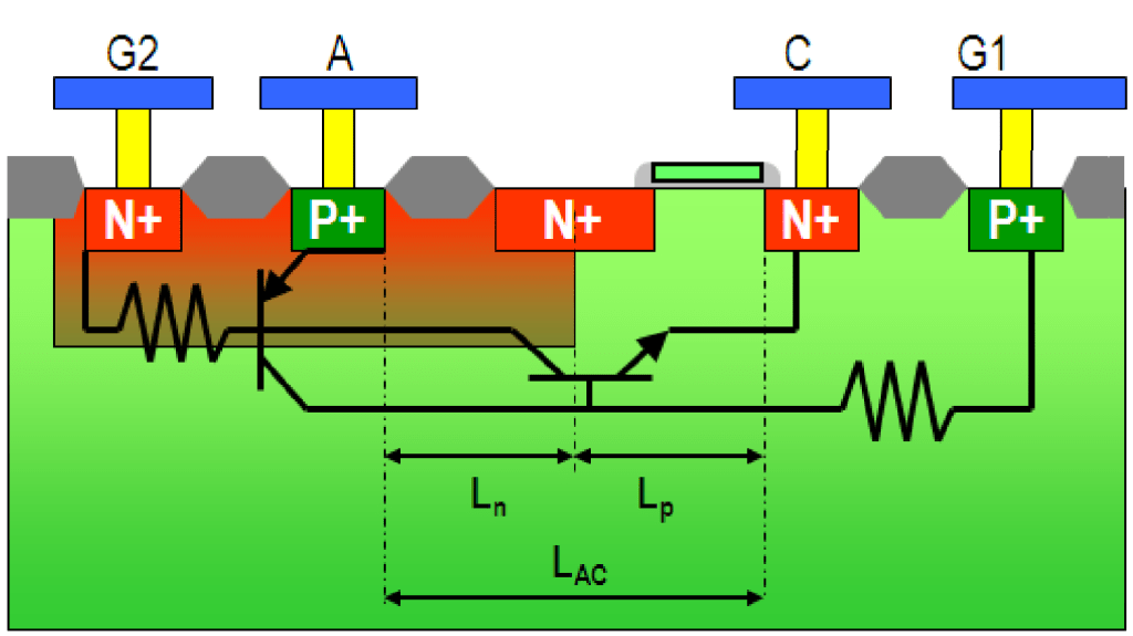 This basic implementation has two inter coupled parasitic devices (lateral NPN and vertical PNP). The configuration creates a positive feedback once either one of the bipolar elements is turned on. The regenerative action is the key behind the snapback and low holding voltage (~1.2V) seen in the IV characteristic. At high currents, the structure behaves as an intrinsic PiN diode. To start the positive feedback, the Anode-Cathode voltage must exceed the Nwell/Pwell avalanche breakdown voltage