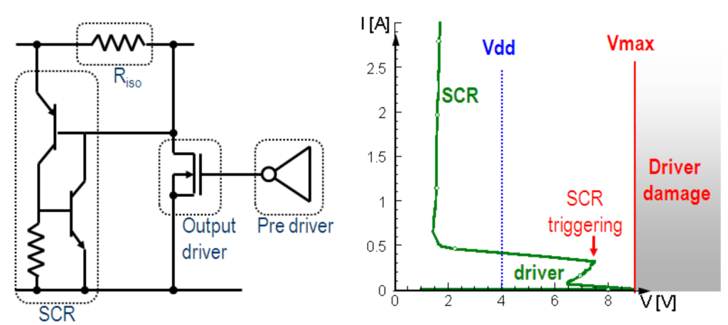 Further, due to the very high ESD performance, area compact and low capacitance protection clamps can be created. However, the basic and LVTSCR did not solve all the problems. People reported latch-up problems due to the low clamping voltage. Moreover, it was difficult to correctly fit the SCR IV curve within the ESD design window. ESD engineers required a number of TEG runs to tune the trigger and holding voltage. Large semiconductor corporations noted serious IV curve fluctuations between their different fabrication plants. Further problems included difficulties to protect output buffers due to competitive trigger issues, lower than expected CDM results due to slow trigger speed and integration problems into advanced technologies (STI isolation, SOI)