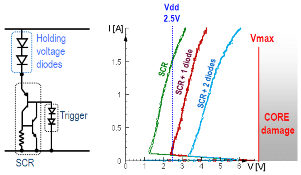 For certain CMOS applications the holding voltage can easily be increased above Vdd by adding diodes in series with the SCR. This is demonstrated in Figure 5 below. Another possibility is to stack multiple SCR’s in series.