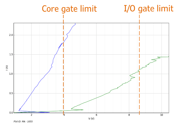On the other side the protection circuit shall shunt the ESD current and keep the voltage drop below the failure voltage of the protected circuit. In case of a thin gate oxide interface, this may align with the thin gate oxide (ESD/transient) breakdown voltage (red line in Figure 1).