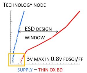 Considering the core transistors and voltage domains in advanced FinFET and FDSOI technology, it follows that the ESD design window for thin gate transistor circuits may be as narrow as 3V only, with a maximum allowable voltage drop during ESD at the protected node (a core transistor circuit) of 4V.