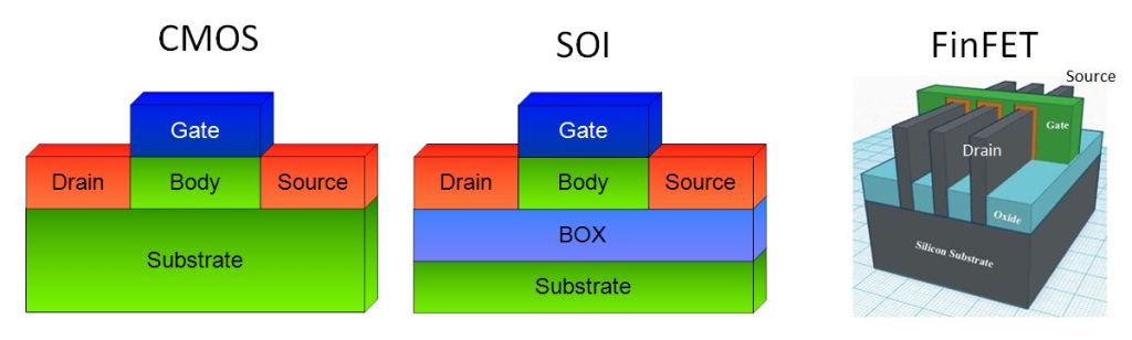 The basic transistor construction is different for the 3 process options. Comparing the device construction (Figure 2), one can see that the plain CMOS technology just has two N+ regions, drain and source, in an P-type well or substrate. Of course, a gate is on top of the device channel. Looking at SOI, a buried oxide (BOX) shields the transistor p-type body from the substrate. This has major consequences for ESD (see below). The FinFET cross-section essentially consists of small stripes (fins) for drain-body-source in parallel, with the gate wrapped around the body for each section. This of course confines the body volume significantly, which enables better control of the channel, but also has a major influence on ESD properties. Note that the transistor body still resides in the substrate. There is no electrical isolation, as is the case for SOI.