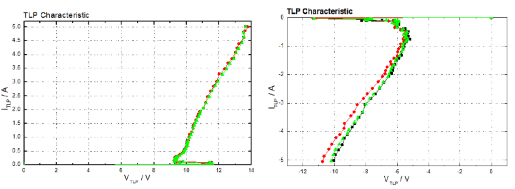The measurement results showed that the different ESD clamp and diode cells reach more than 5A TLP. The example below shows analysis on the bidirectional clamp used for the -4V to 5V interface that can be used in cold sparing interfaces. The designs were later used in a satellite, circling earth.