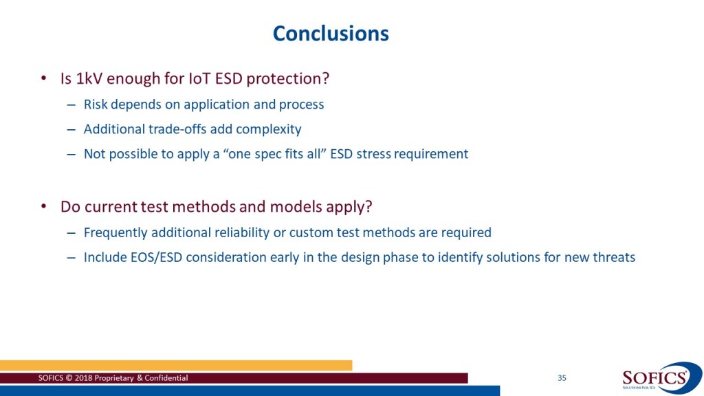 This presentation helps the audience to select the right ESD/EOS/latch-up requirements for IoT applications. Many Internet of Things (IoT) applications can be made in older, depreciated fabrication plants (0.25um, 180nm, 130nm) that were top-notch 10+ years ago. We learned, by supporting innovative semiconductor startups, that many of the applications in IoT require special attention with respect to ESD and EOS protection.