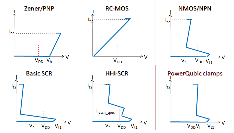 On the other hand there are clamps with a high holding voltage like PNP or zener devices. These are used for power/rail clamps because they provide enhanced latch-up immunity. The zener/PNP are straigthforward but typically require a large silicon area, even for regular ESD robustness. Moreover, the trigger and clamping voltage is fixed by the process. It is not possible to change the trigger voltage.