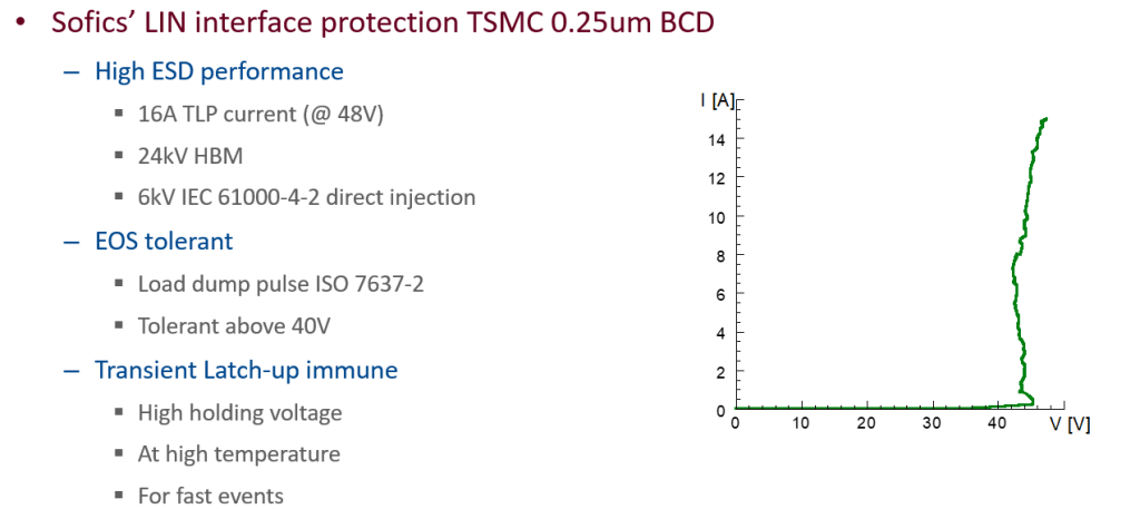 Another customer was developing a chip for automotive applications. It included an automotive LIN transceiver. While the LIN bus runs at 12V, devices connected to the LIN bus need to be able to sustain much higher transient voltages (40V). The LIN interface also needs higher ESD protection. For their chip in TSMC 0.25um BCD a PowerQubic device was customized.