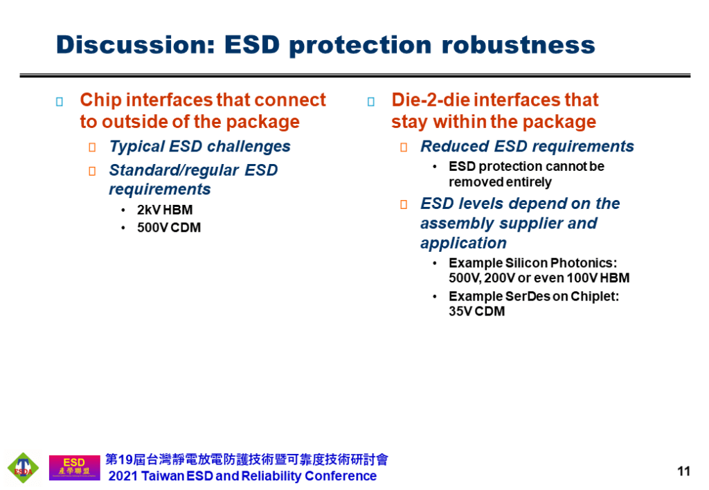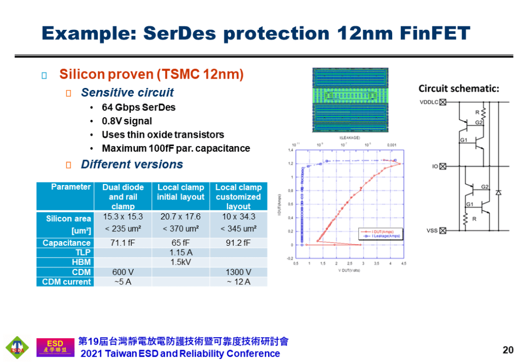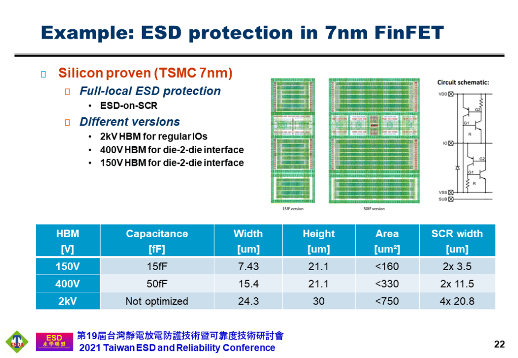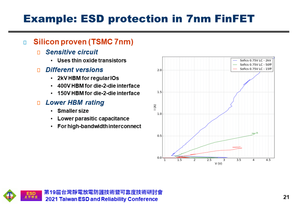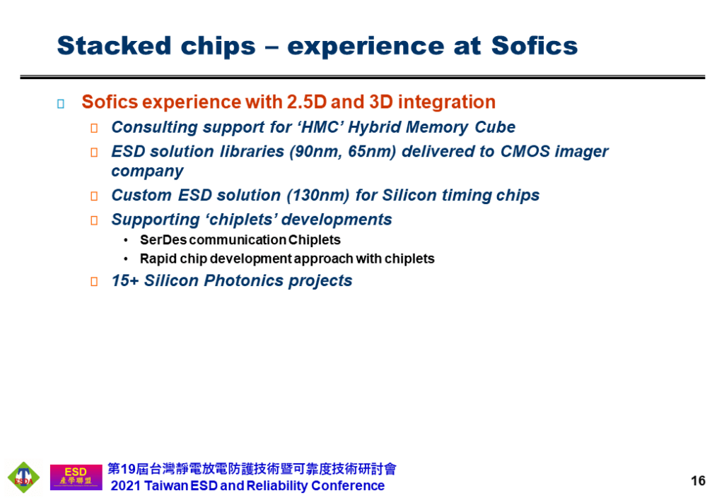 Sofics has supported a number of hybrid integration projects. The technology is easily adapted to match requirements. Several customers have used the local ESD protection clamps for their products. The presentation focused on low-cap ESD cells for high-speed die-2-die interfaces in FinFET technologies.