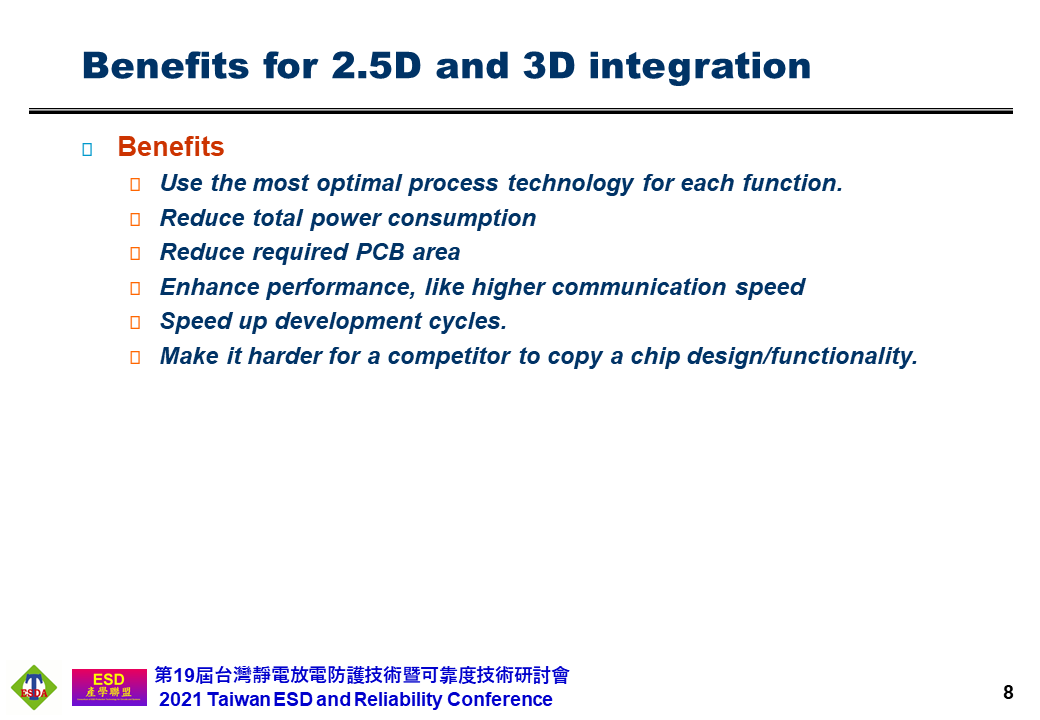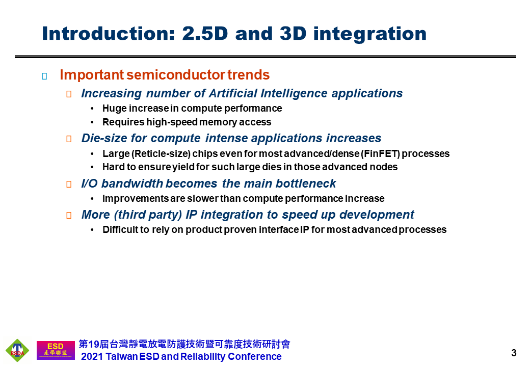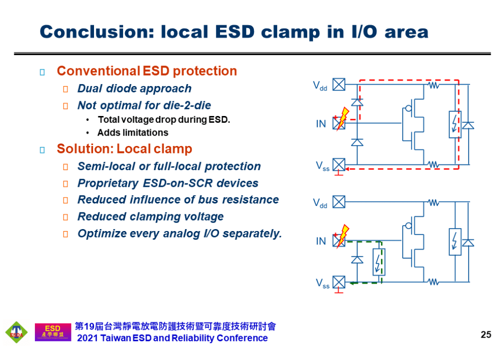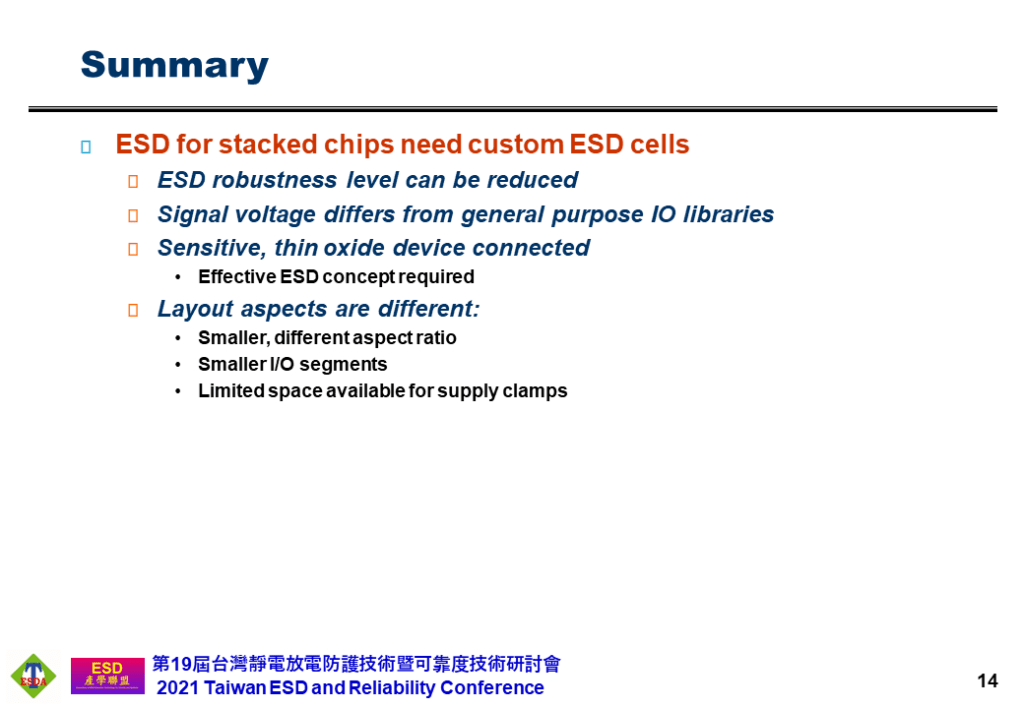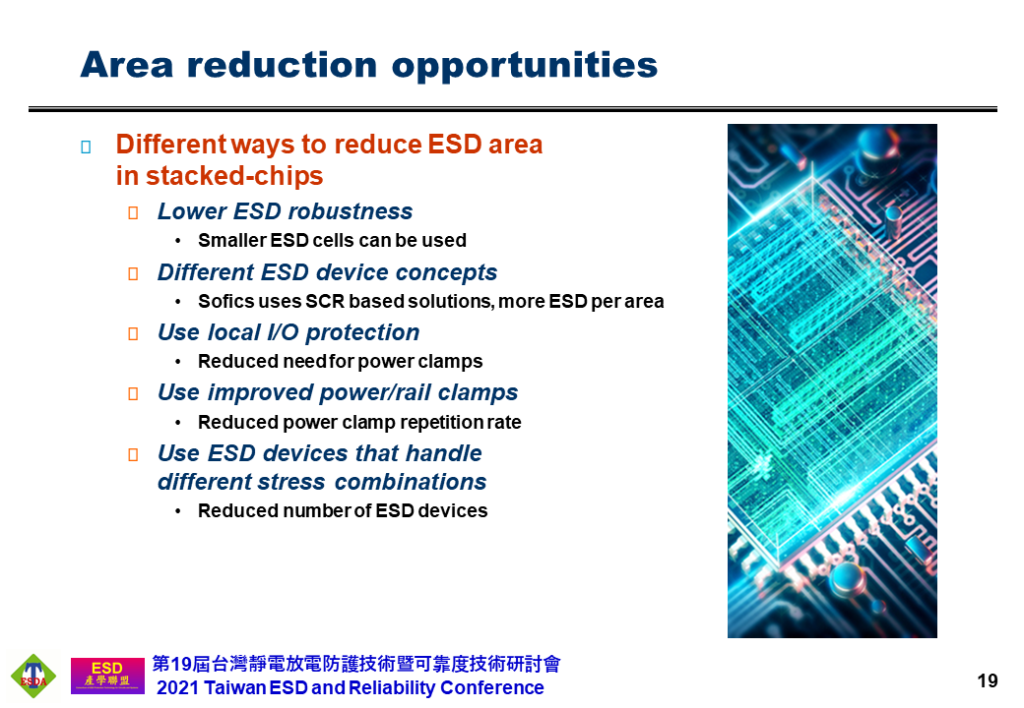 Sofics has supported a number of hybrid integration projects. The technology is easily adapted to match requirements. Several customers have used the local ESD protection clamps for their products. The presentation focused on low-cap ESD cells for high-speed die-2-die interfaces in FinFET technologies.