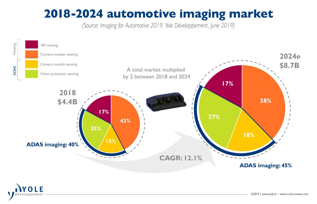 CMOS imagers are used in many different markets. Consumer electronics (e.g. smartphones) represents the biggest part but the sensors are also used in surveillance and security, space, healthcare and automotive products. That last segment is actually growing faster than the total CIS market. The number of image sensors per car is increasing quickly both for viewing as for ADAS type of functionality. The total market value in automotive is projected to double from 2018 to 2024, according to Yole (link).